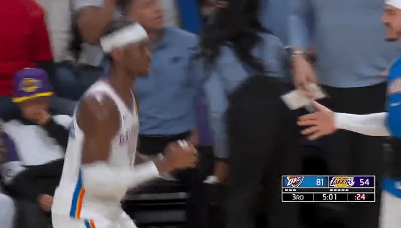 第三节比赛中,亚历山大三分投进得到19分,雷霆下半场16-7领先湖人27分。